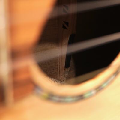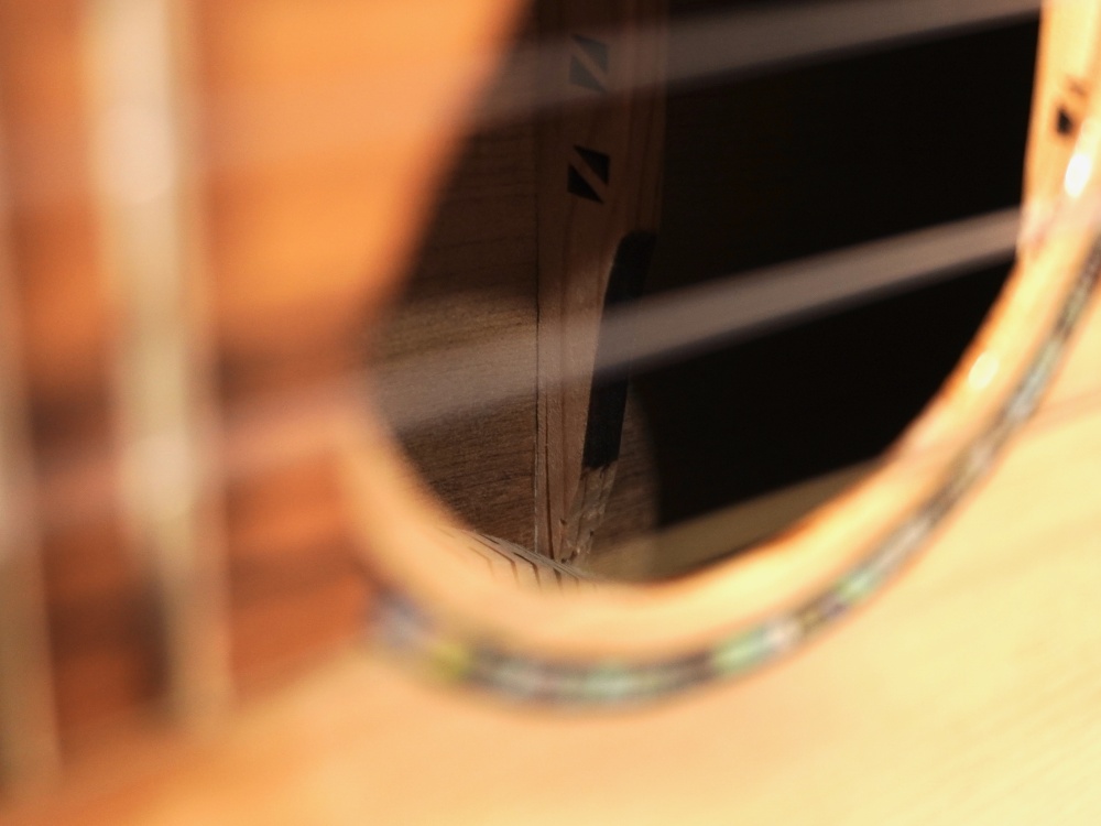 サウンドホール周りにはローズウッドの巻きとアバロンのロゼッタが施されています。