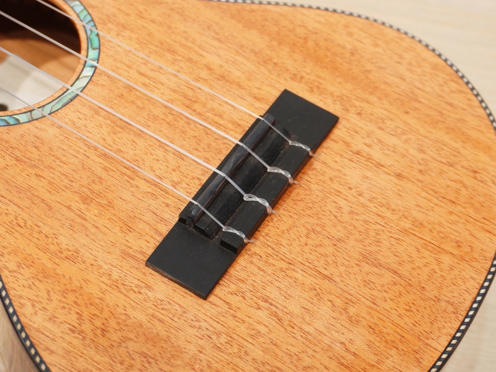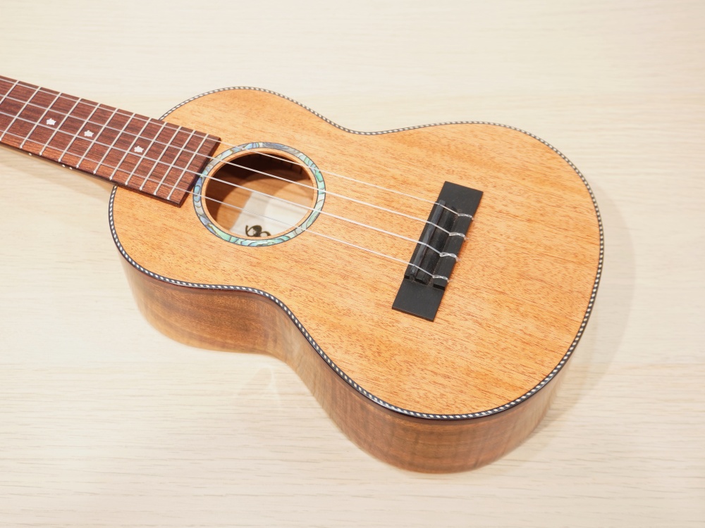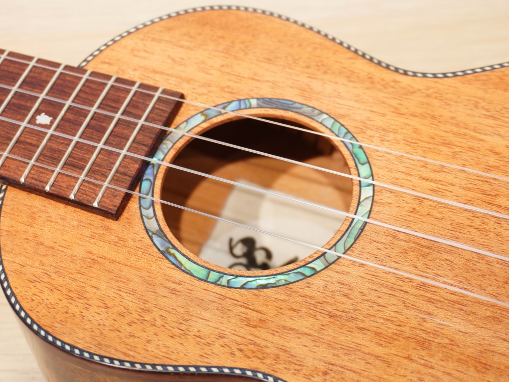 オールマホガニーではなく、サイドにハワイアンコアを使用、やわらかさとコアのコロッとした特徴が合わさったウクレレです。